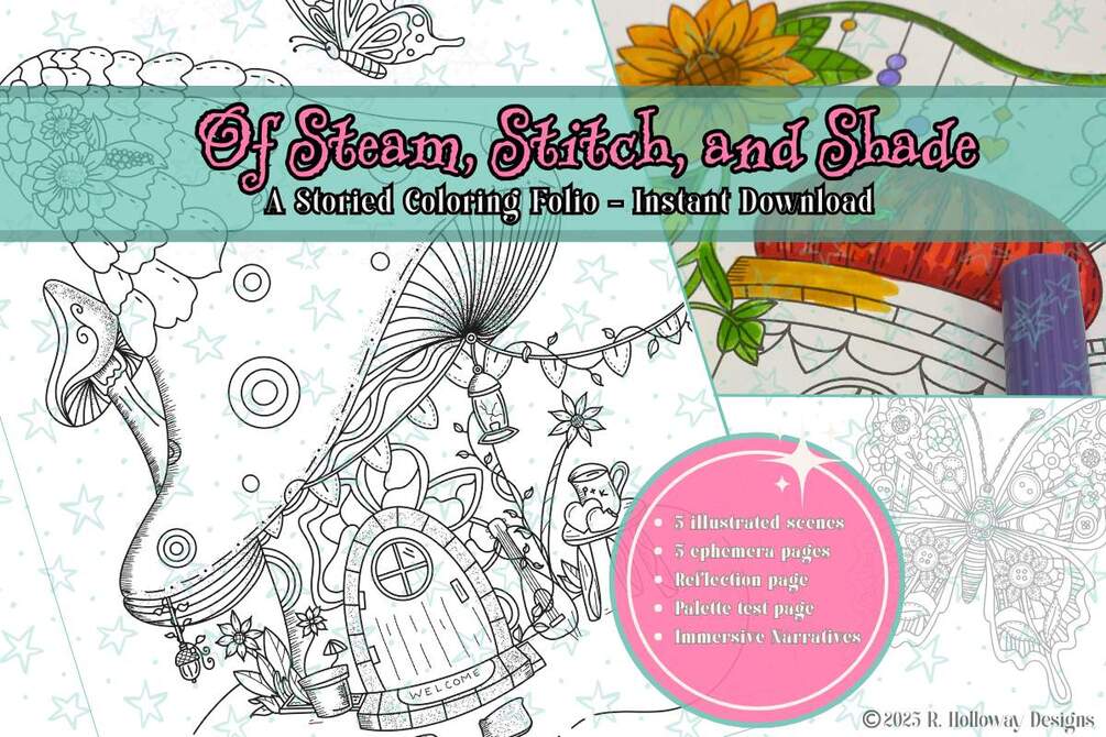 Of Steam, Stitch, and Shade is a 20-page lore-illustrated coloring folio from the Hollowed Wild — a quiet archive of memory, soft mystery, and symbolic healing.