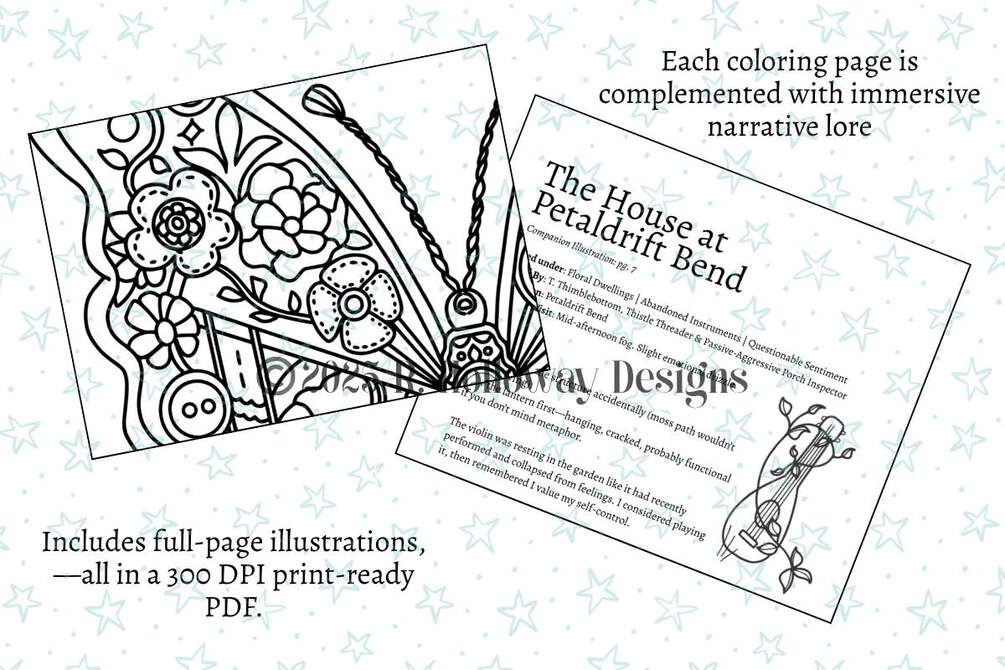 Within these pages, you'll find three poetic house-scene illustrations, illustrated lore fragments, and field notes from T. Thimblebottom, archivist of forgotten things. Each piece is drawn in detailed black-and-white linework, designed for immersive adult coloring and emotional reflection.